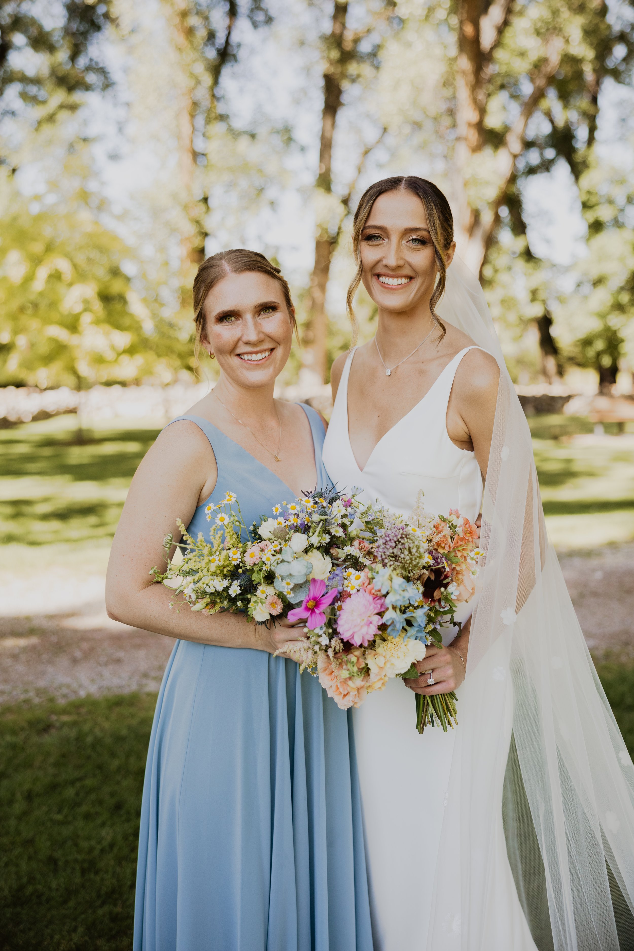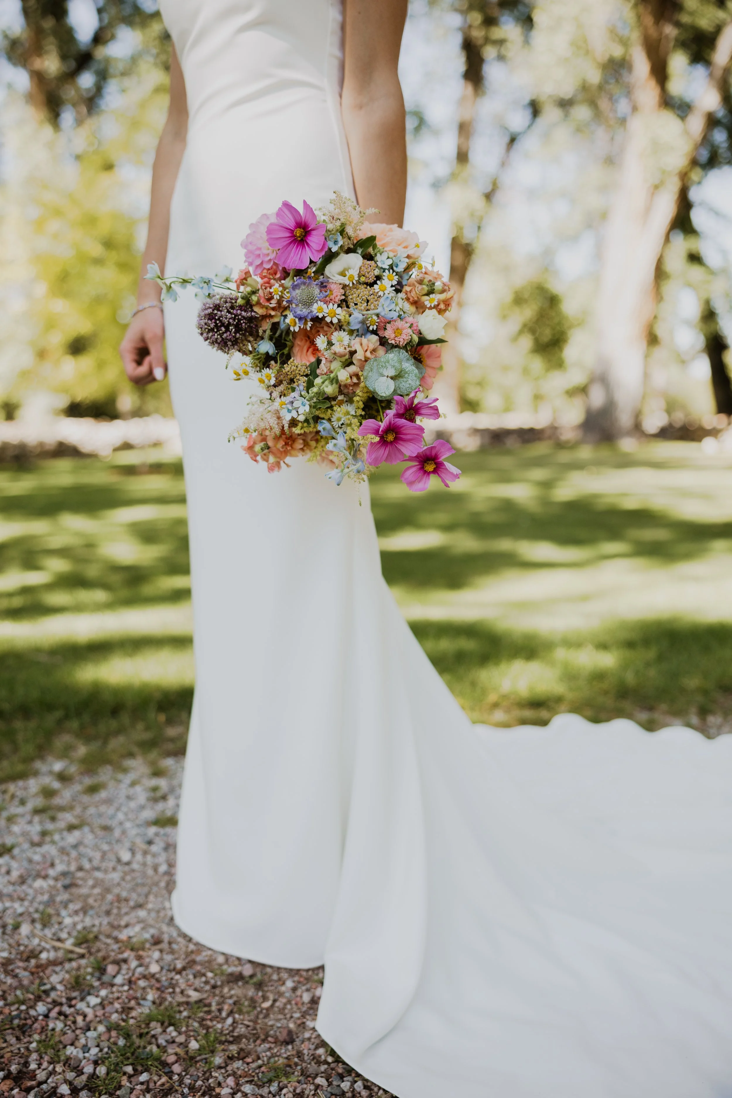 Bianca’s August bouquet was inspired by a wildflower meadow and included more than a dozen types of flowers in soft pastel colors including garden roses, snapdragons, zinnias and cosmos from Sheridan gardens, pale blue tweedia, ruffled scabiosa, and chamomile among others. We also added a special keepsake to carry along with her flowers.
