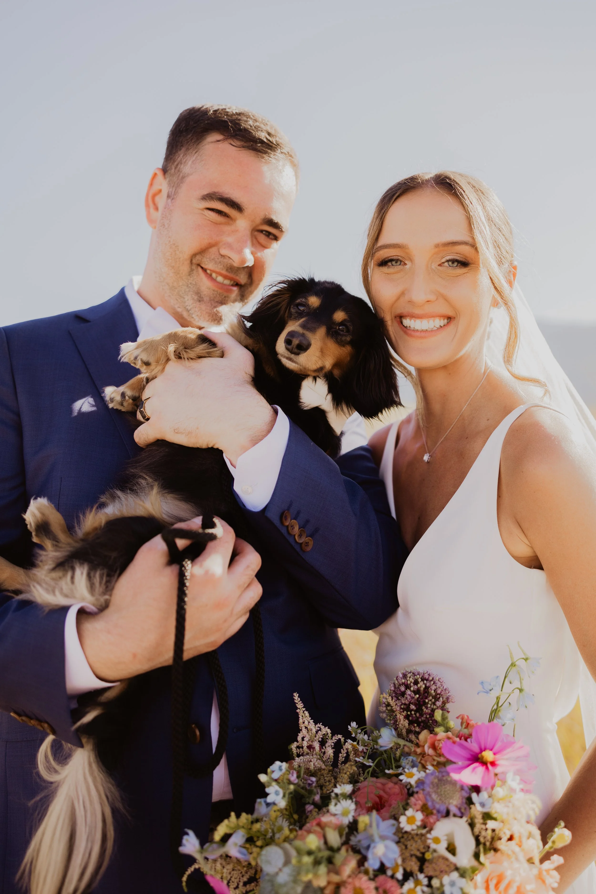 Their ceremony took place an a late summer meadow with golden grasses and the Bighorn Mountains as their backdrop. We created a long floral meadow arch will with soft colors and fun textures including alliums, amaranth and ruffled garden roses. After walking down the aisle, their wedding party sat with the guests - leaving all eyes on the bride and groom and their stunning view.
